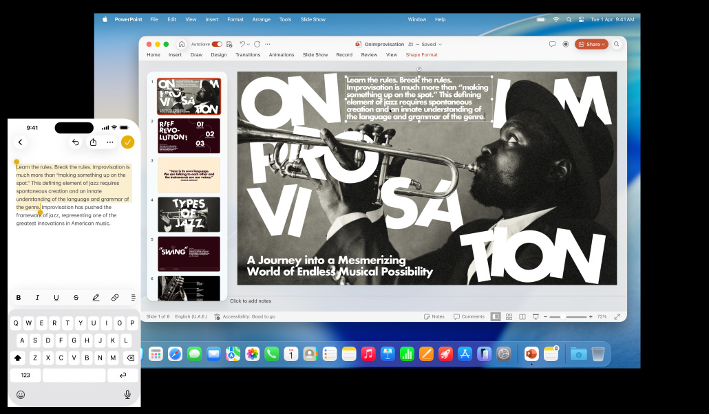 iPhone 16 Plus with text highlighted in the Notes app, 13-inch Macbook Air with a Keynote slide open, text from Notes app is visible on the slide