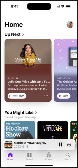 CarPlay lets you listen seamlessly from your iPhone in your car, bringing the same in‑depth experience to your vehicle’s built‑in controls.2 You can even ask Siri to play the latest episode or control playback. And Apple Podcasts comes preinstalled in select car models.