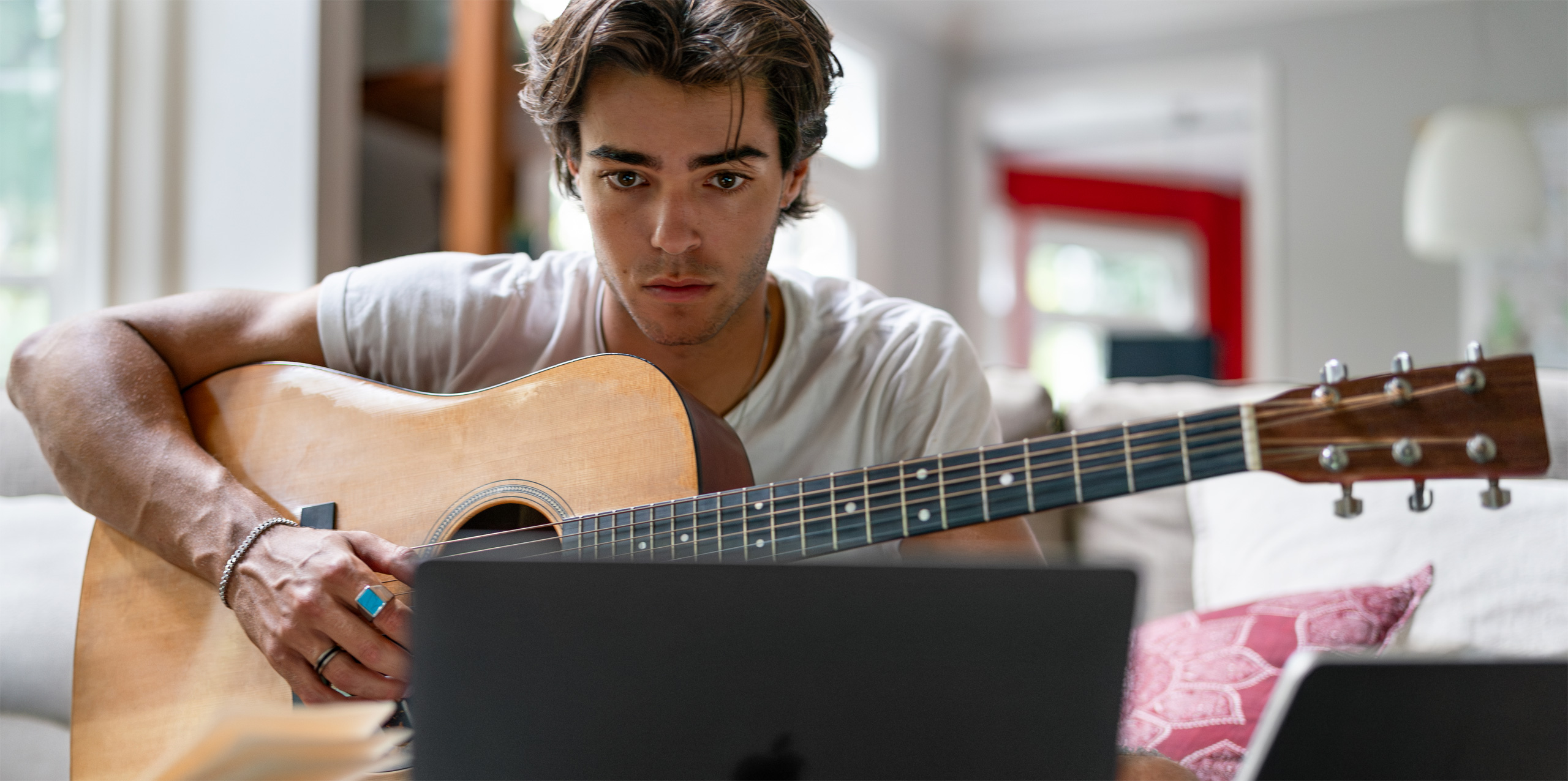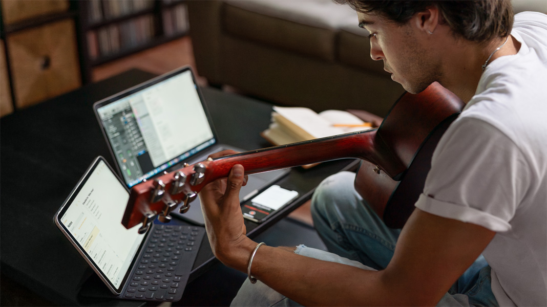 As a singer and songwriter, Max says inspiration can come anytime, and he needs to be ready. He uses Voice Memos on iPhone to capture song ideas in the moment, then picks them up on Mac to bring them to life in different arrangements.
