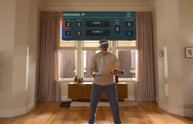 Les jeux visionOS vous offrent des façons de jouer captivantes en exploitant l’espace autour de vous. Avec un suivi de la main jusqu’à 90 Hz, les jeux spatiaux sont plus fluides et plus réactifs que jamais. Vous pouvez également profiter de certains jeux, comme Pickle Pro, à six degrés de liberté grâce à la manette PlayStation VR2 Sense3.