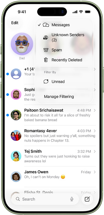 Terjemahkan teks secara otomatis di Pesan,15 dan dapatkan teks terjemahan langsung di FaceTime dan terjemahan lisan di aplikasi Telepon.4