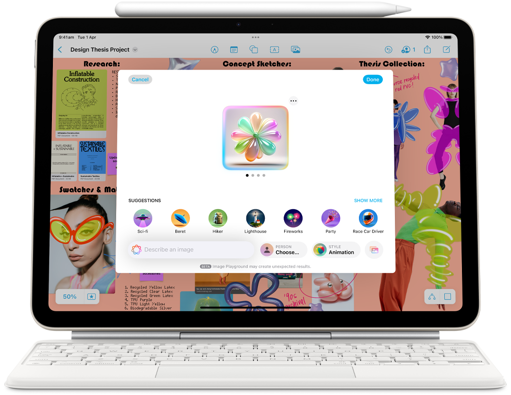 Landscape view of iPad Air showcasing Apple Intelligence with Image Playground, and Keynote, Apple Pencil Pro